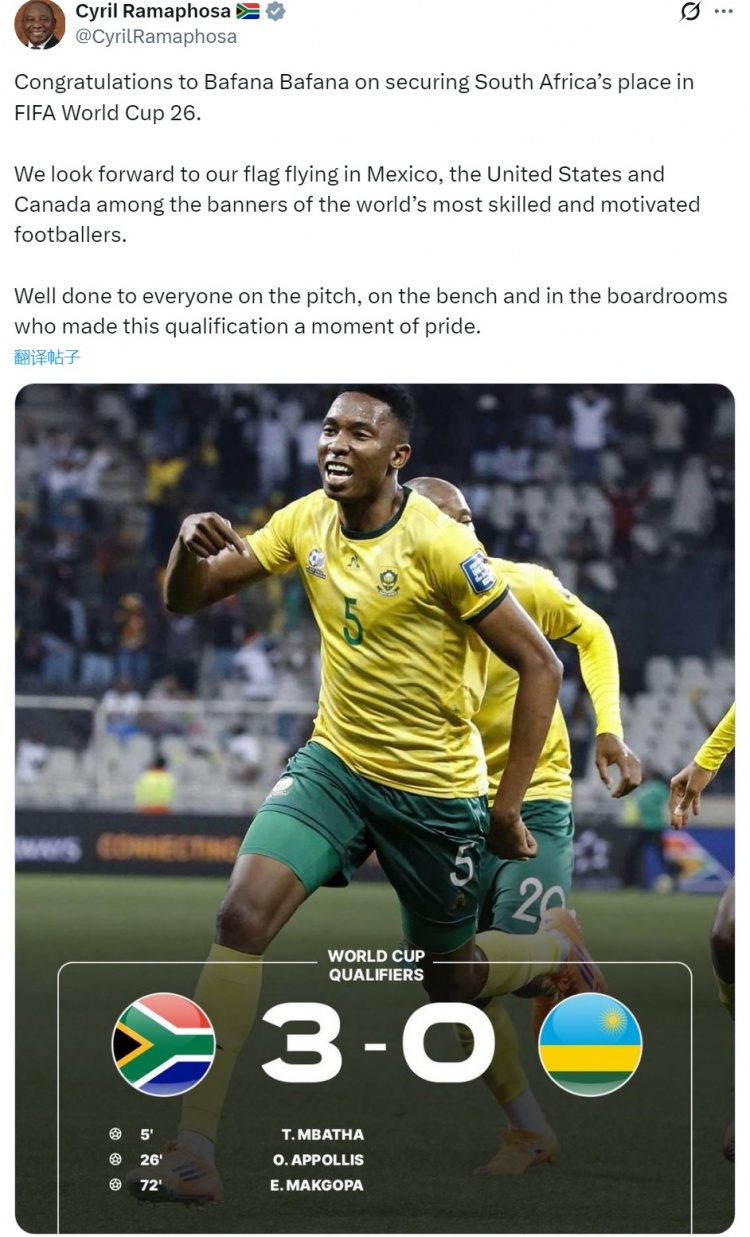 南非总统拉马福萨连发两条推文,对南非队暗意道喜,首条推文写说念:“咱们抨击2026年寰球杯!祝贺南非国度队合座成员,统统这个词南非将一如既往地缓助你们,一说念同业。”