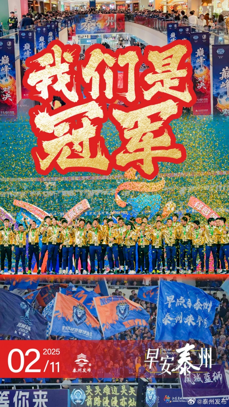 11月2日讯 首届苏超落下帷幕,泰州队点球打败南通队夺得冠军。“泰州发布”发文称:笃信笃信的力量!笃信梦念念!笃信名胜!!