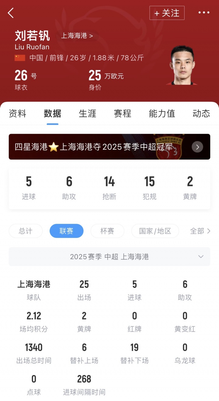 26岁的刘若钒冬窗加盟海港,本赛季推崇出色,5球6助匡助海港夺冠。