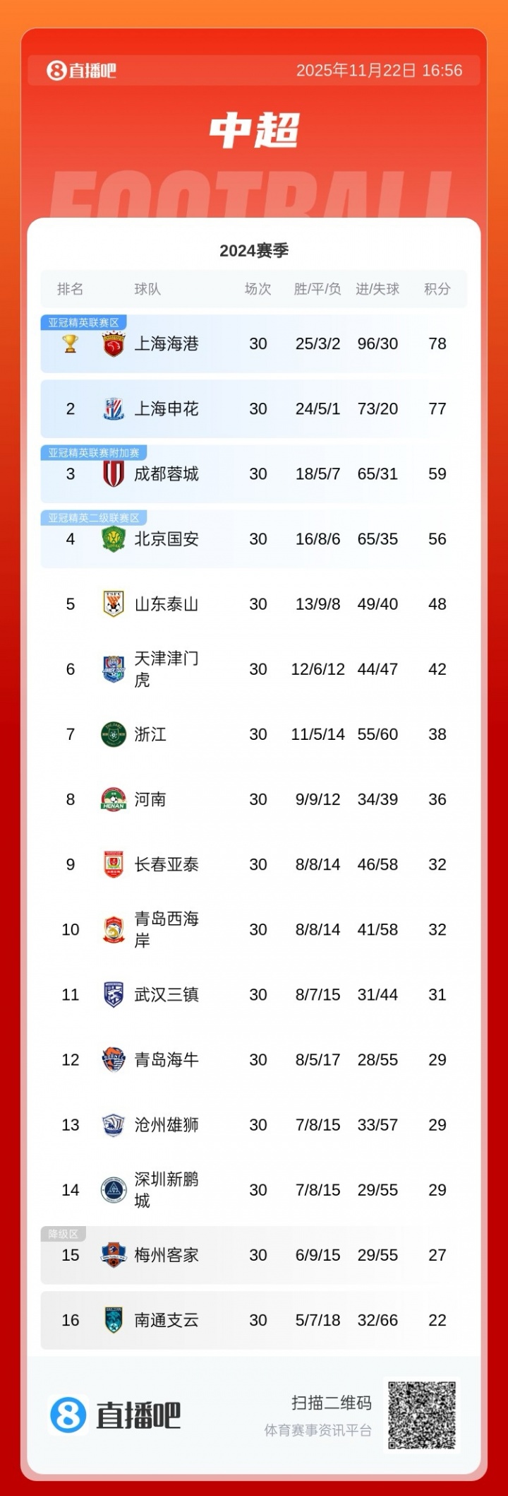 11月22日讯 2025赛季中超落下帷幕,上海海港顺利卫冕中超冠军,上海申花再次获取亚军。