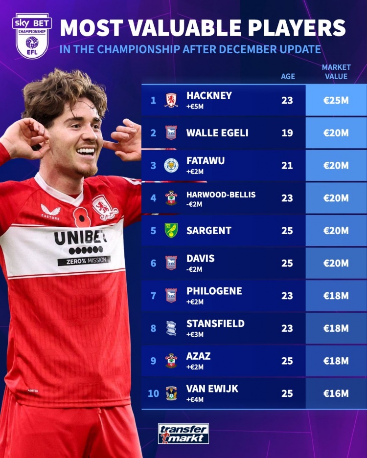 12月3日讯 德国转会阛阓更新英冠球员身价,并排出英冠球员最新身价名次。