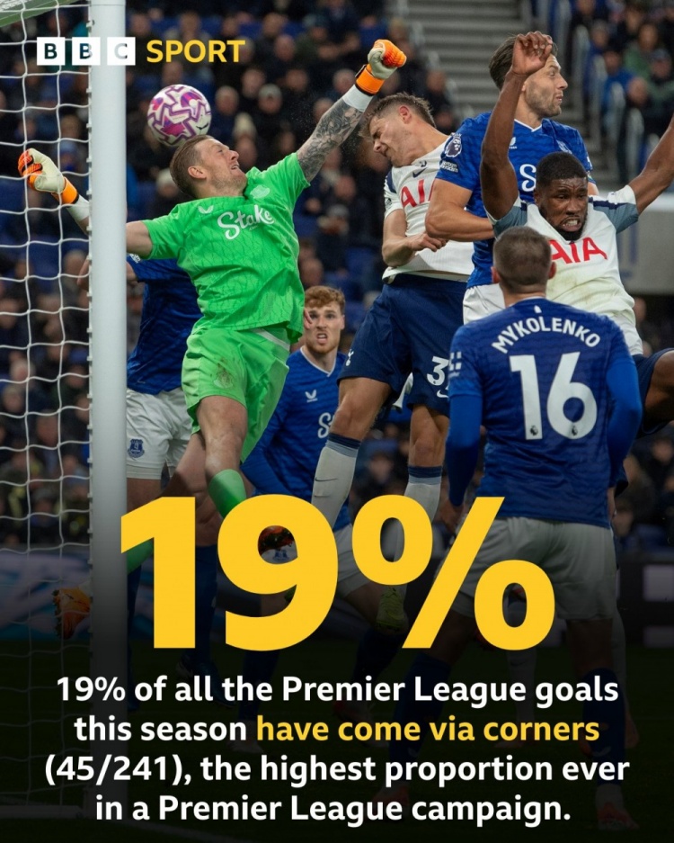 数据统计表现,本赛季英超共进241球、其中45球来自角球迫切,19%的比率亦然英超单赛季最高。
