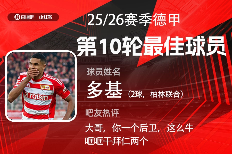第十轮评比效力结出炉,柏林聚鸠合卫多基梅开二度,匡助球队2-2战平拜仁,已矣后者开局16连胜记录,当选【X小红书德甲第10轮最好球员】!
