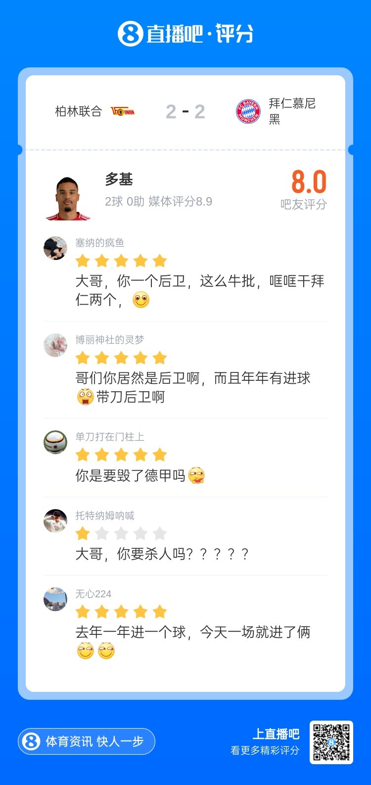 吧友热评:老大,你一个后卫,这样牛,哐哐干拜仁两个