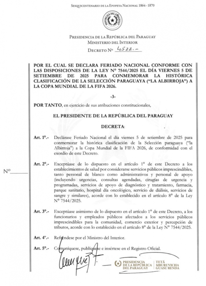 第1条: 告示2025年9月5日(星期五)为世界性沐日,以挂牵巴拉圭国度男人足球队历史性地晋级2026年国外足联世界杯,合适本国法引子部分所述。