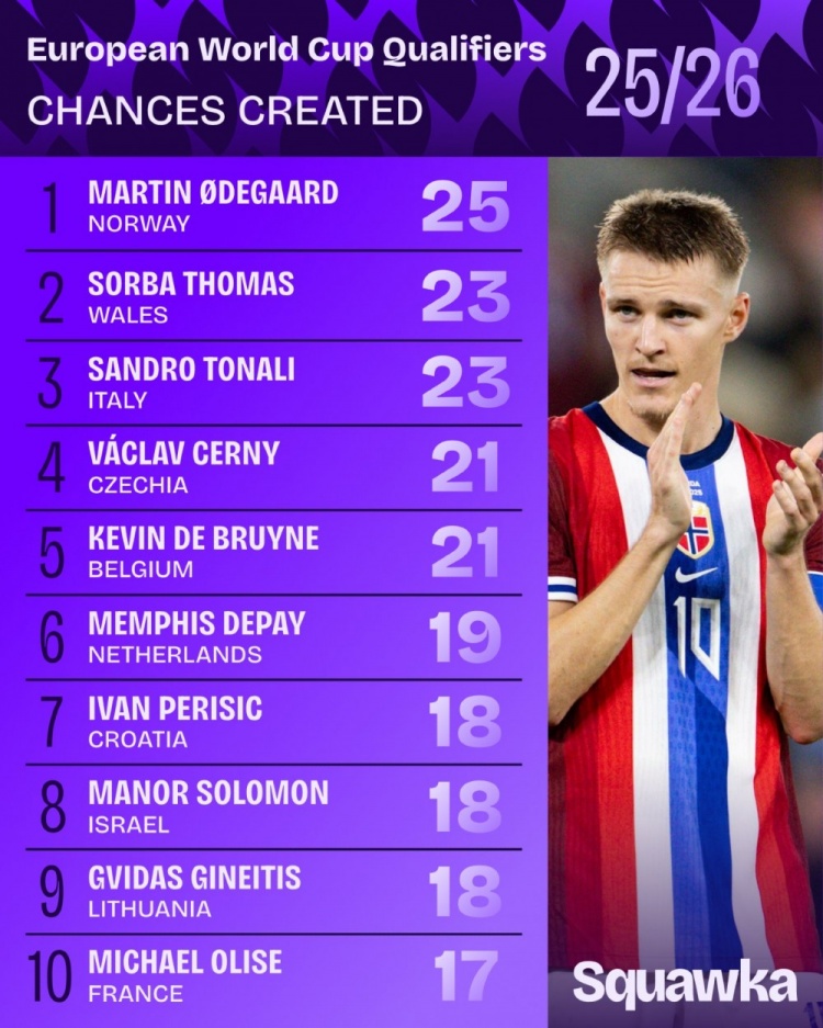 10月15日讯 据Squawka统计,厄德高是本届欧洲世初赛创造契机最多的球员。