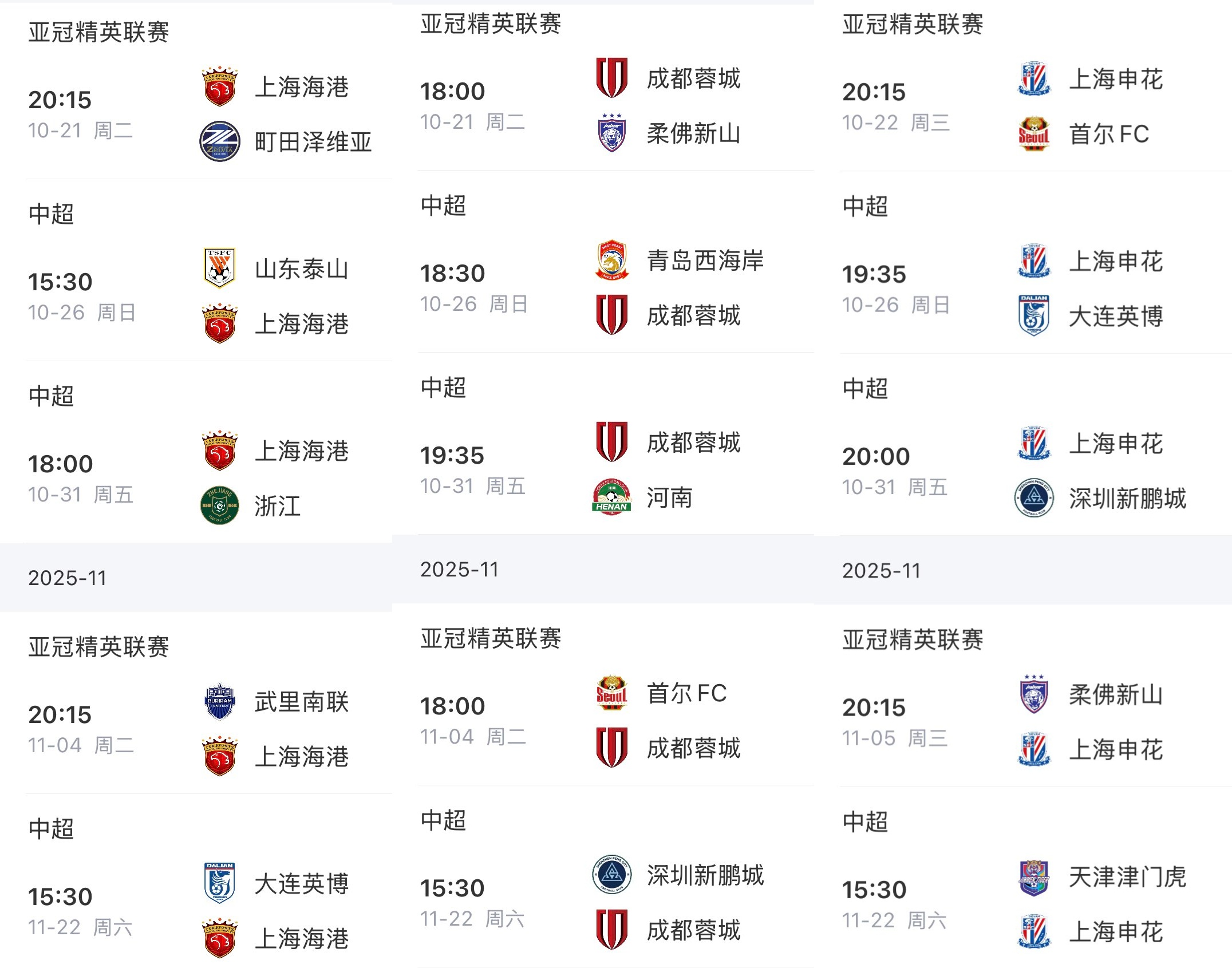 10月17日讯 中超还剩临了3轮,海港、蓉城、申花剩余赛程如下。