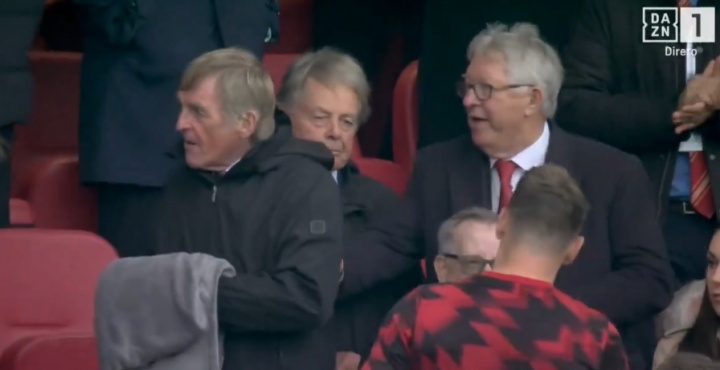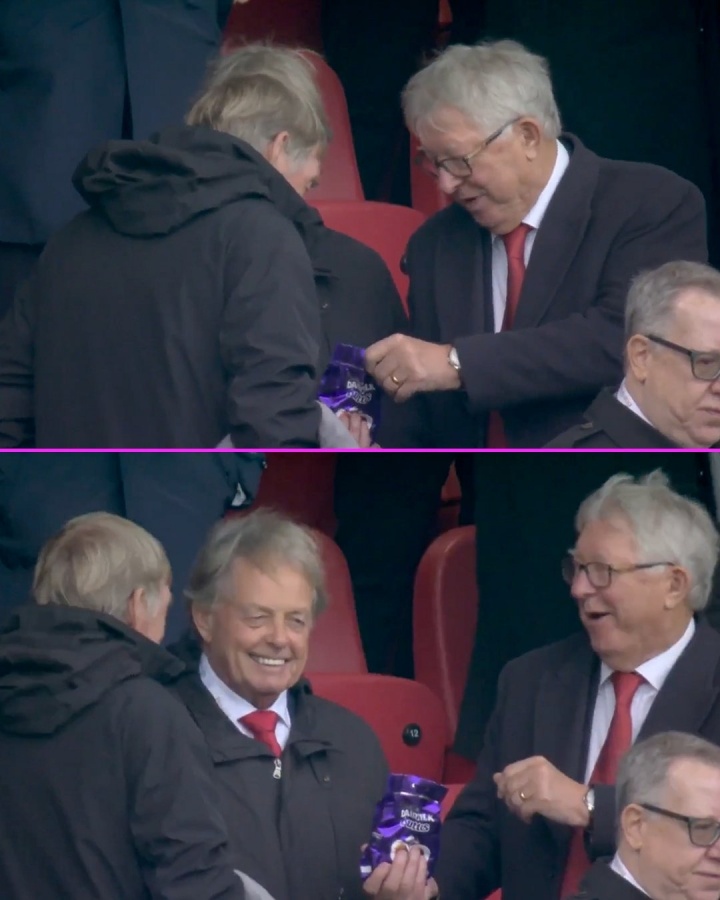 10月20日讯 曼联vs利物浦下半场,镜头给到看台上,弗格森在看台上共享巧克力给达格利什,此时比分曼联1-0朝上!