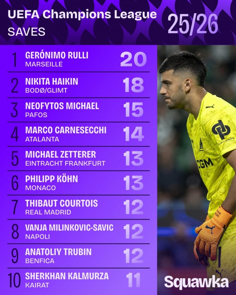 本赛季欧冠扑救榜: