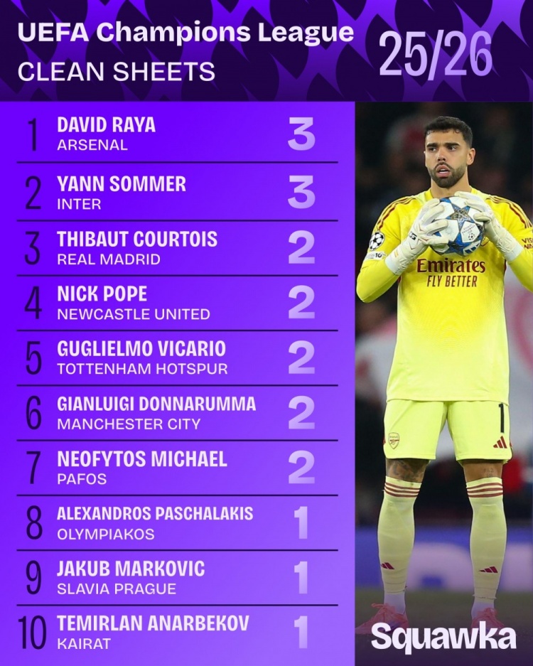 本赛季欧冠零封榜: