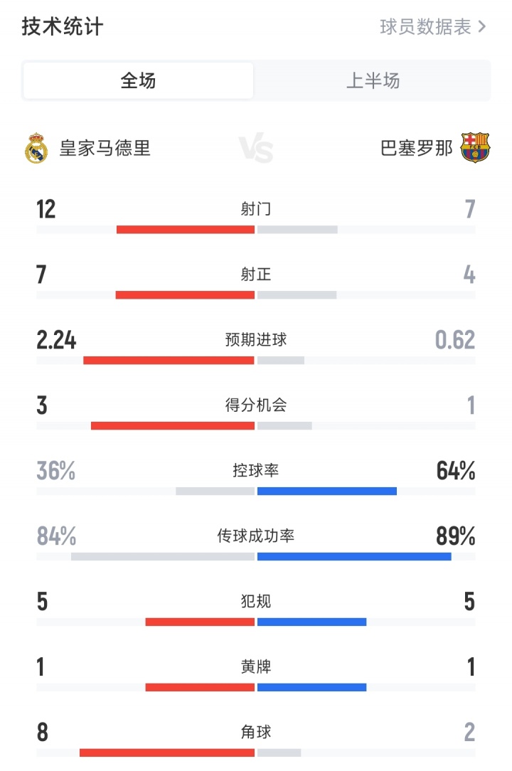 10月27日讯 国度德比半场,皇马2-1逾越巴萨!两边各孝顺了精彩的半场,以下是半场数据: