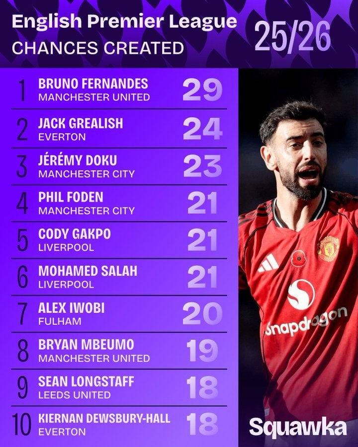 11月11日讯 英超联赛还是进行了11轮,squakwa也统计了本赛季英超创造契机情况,B致力于压格拉利什居首。