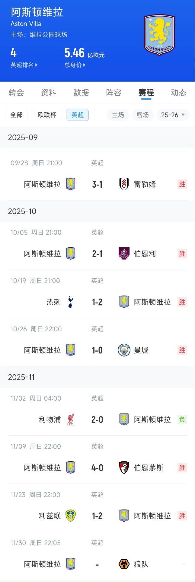 11月24日讯 英超第12轮,阿斯顿维拉2-1打败利兹联,近7轮英超获取6胜1负狂砍18分。