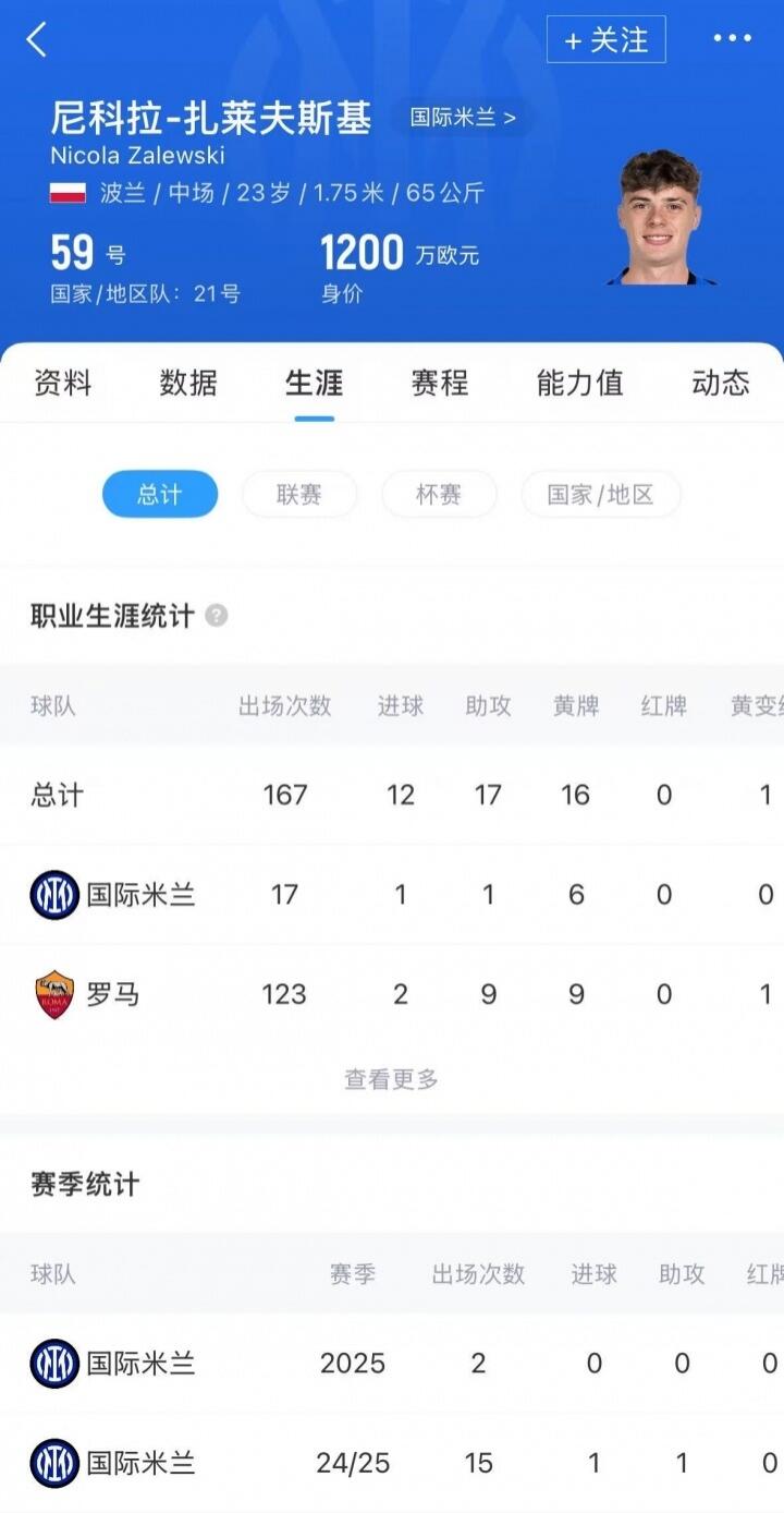 扎莱夫斯基现年23岁,波兰中场,上赛季代表国米各赛事出场15次,孝顺1球1助,现在球员德回身价为1200万欧元。