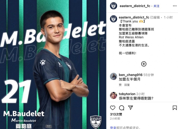 东区俱乐部在官方ins晒出简柏庭的海报,并配文写说念:“我俱乐部在此文书,简柏庭也曾离队加盟德国第五级别联赛球队Rot Weiss Allen,据他本东说念主涌现他不太符合在中国香港的生存。祝他一切顺利!”