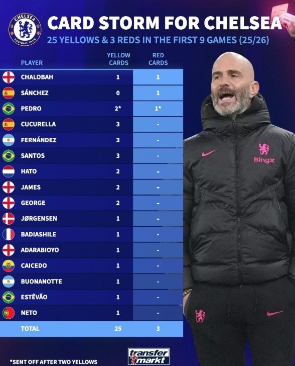 10月1日讯 德国转会市集统计,切尔西新赛季前9场比赛,领到25张黄牌和3张红牌。