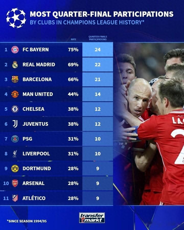 结果显示,拜仁慕尼黑以24次高居榜首,皇马和巴萨分别以22次和21次紧随其后,形成“皇萨仁”三巨头断层领先的格局。曼联以14次位列第四,是英超战队中进入下一轮八强次数最多的代表。