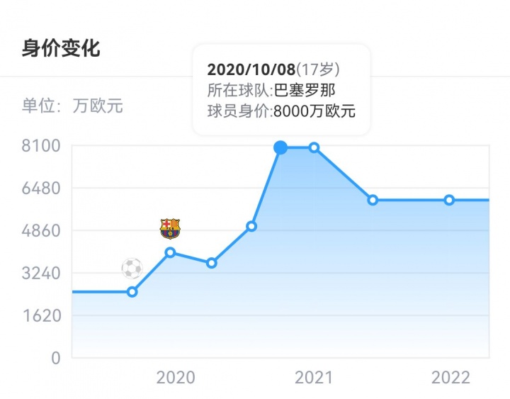 他在2020年达到了个东谈主巅峰身价8000万欧元,但随后受困于联贯伤病,身价一齐走低,现时仅剩500万欧。