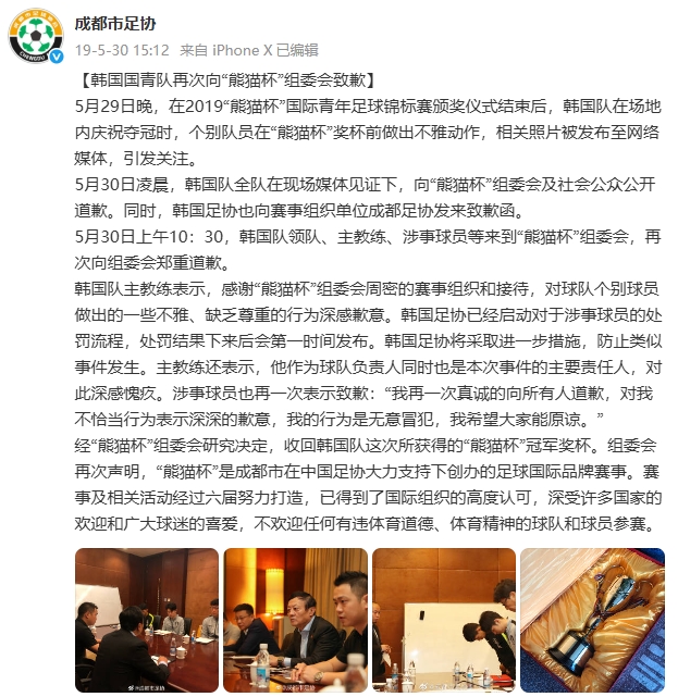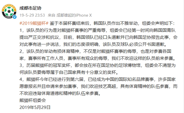 2019年熊猫杯,韩国国青终末一轮3-0礼服中国国青,三战全胜夺得冠军。授奖典礼后,韩国球员朴规现脚踩奖杯作念出瞻念手脚,相干相片被发布至收罗媒体,激勉平方珍贵。最终,韩国队公开致歉,赛事组委会晓谕,收回韩国队得回的熊猫杯冠军奖杯。
