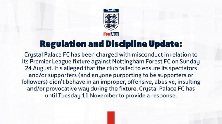 11月5日讯 英足总发布官方公告,阐述水晶宫俱乐部因球迷活动不妥遭到指控,需要在11月11日之前作念出回话。