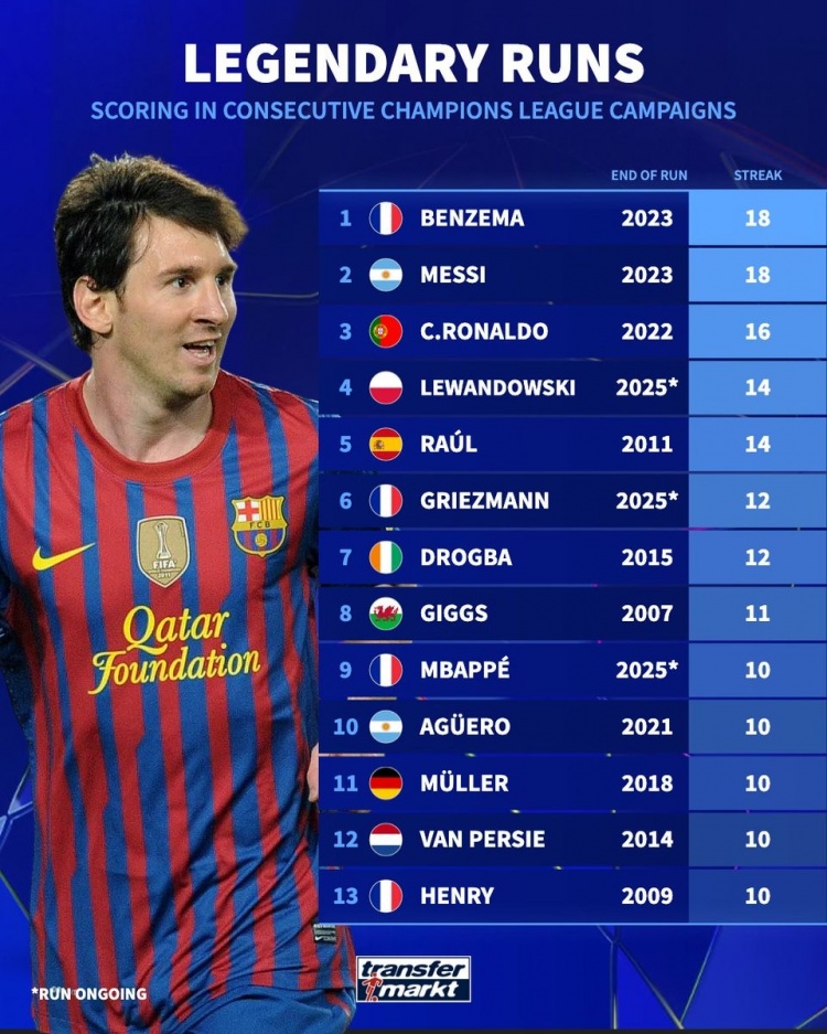 11月27日讯 《转会市集》统计了欧冠历史赛季邻接进球情况,梅西和本泽马比肩居首。
